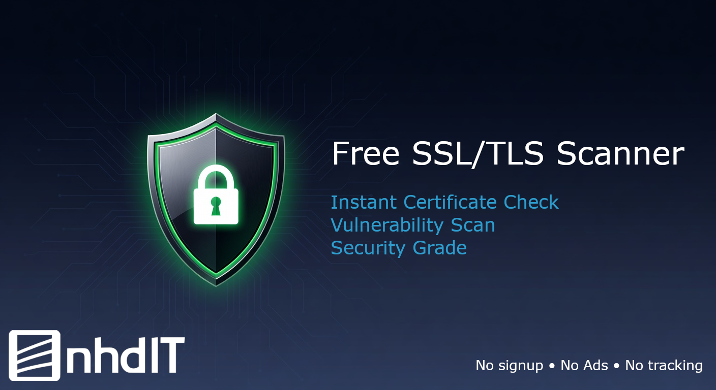 Disclaimer: This tool is provided “AS IS” without warranties of any kind, express or implied, including but not limited to the warranties of merchantability, fitness for a particular purpose, and non-infringement. nhdIT, LLC makes no guarantees regarding the accuracy, completeness, or timeliness of scan results. This tool does not constitute a professional security audit, penetration test, or compliance assessment. Users are solely responsible for their own security posture and any actions taken based on the results provided. Do not use this tool to scan systems you do not own or have explicit authorization to test. By using this service, you agree that nhdIT, LLC shall not be liable for any damages, losses, or consequences arising from the use of or reliance on the information provided.